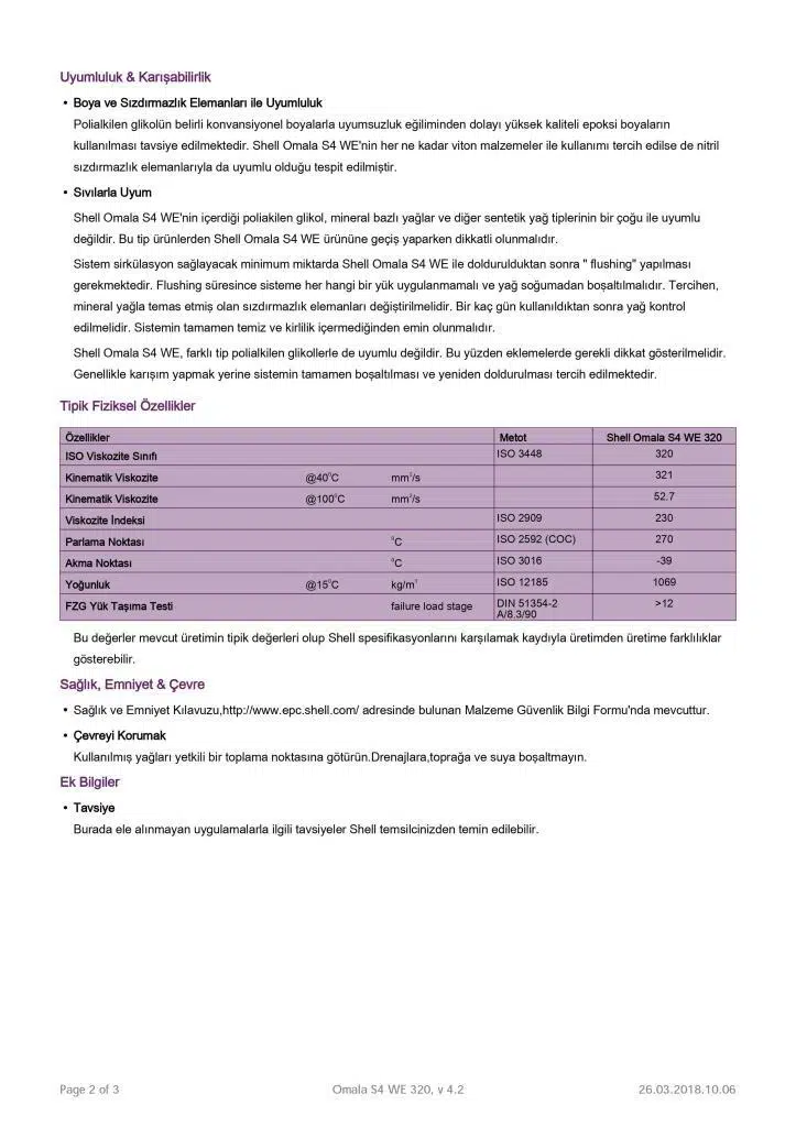 Shell Omala S4 WE yağları, yüksek performanslı, aşınmayı önleyen, PAG (sentetik polyalkylene glycol) bazlı ve özellikle micro-pittinge karşı yüksek koruma sağlayan dişli yağıdır