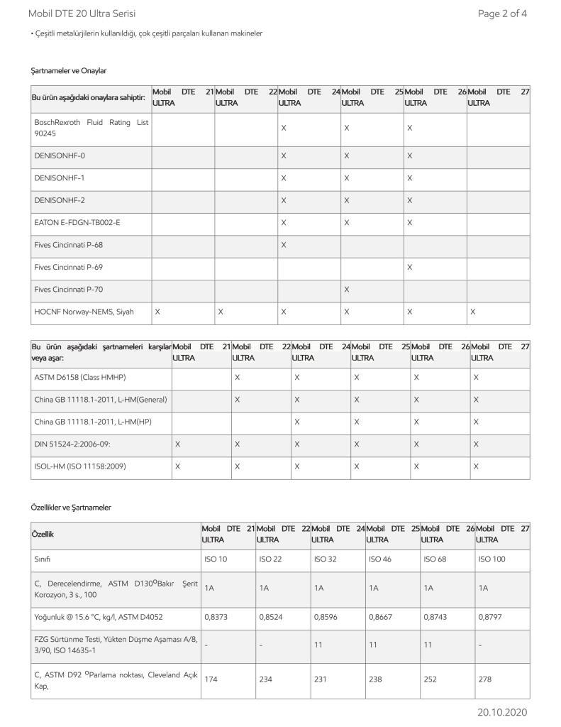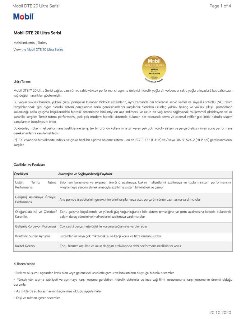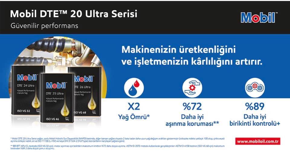 Mobil DTE ™ 20 Ultra Serisi yağlar, uzun ömre sahip yüksek performanslı aşınma önleyici hidrolik yağlardır ve benzer rakip yağlara kıyasla 2 kat daha uzun yağ değişim aralıkları göstermiştir.