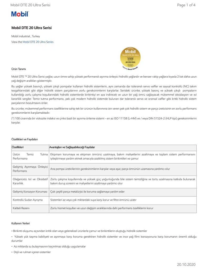 Mobil DTE ™ 20 Ultra Serisi yağlar, uzun ömre sahip yüksek performanslı aşınma önleyici hidrolik yağlardır ve benzer rakip yağlara kıyasla 2 kat daha uzun yağ değişim aralıkları göstermiştir.