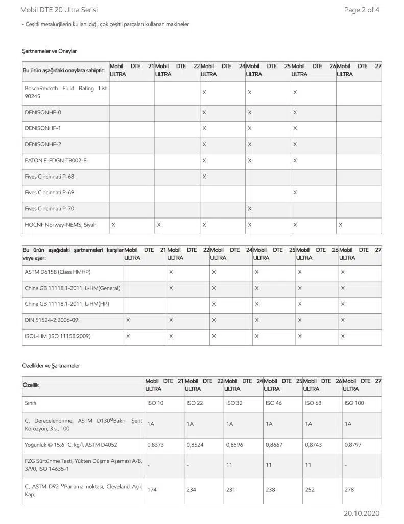 Bu ürün aşağıdaki şartnameleri karşılar veya aşar: | Mobil DTE 21 ULTRA | Mobil DTE 22 ULTRA | Mobil DTE 24 ULTRA | Mobil DTE 25 ULTRA | Mobil DTE 26 ULTRA | Mobil DTE 27 ULTRA |
