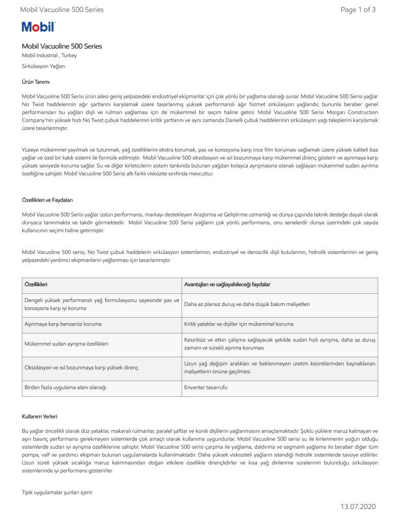 Mobil Vacuoline 500 Serisi yağların çok yönlü performansı, onu senelerdir dünya üzerindeki çok sayıdakullanıcının seçimi haline getirmiştir.Mobil Vacuoline 500 serisi, No Twist çubuk haddelerin sirkülasyon sistemlerinin, endüstriyel ve denizcilik dişli kutularının, hidrolik sistemlerinin ve geniş yelpazedeki yardımcı ekipmanların yağlanması için tasarlanmıştır.