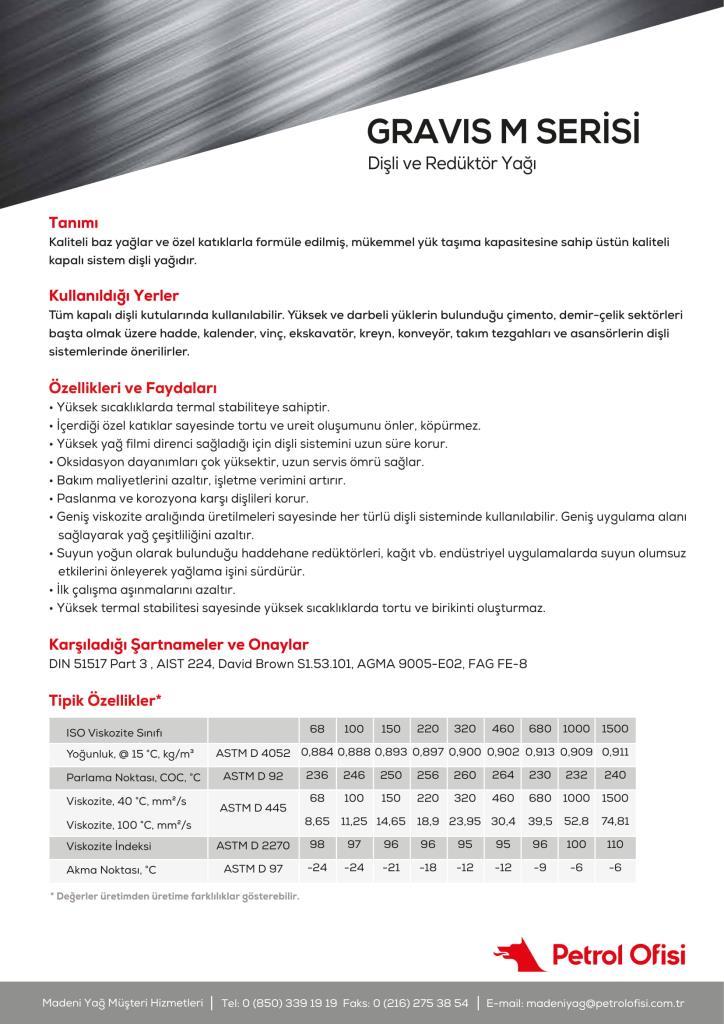 Tum kapalı sistem disli kutularında kullanılabilir. Yeni nesil katkı maddeleri ile uretilen GRAVIS M yağlarımız uluslararası sartnamelere uygun yağ kullanılmasını isteyen ekipman ureticilerinin isteklerini karsılamaktadır.