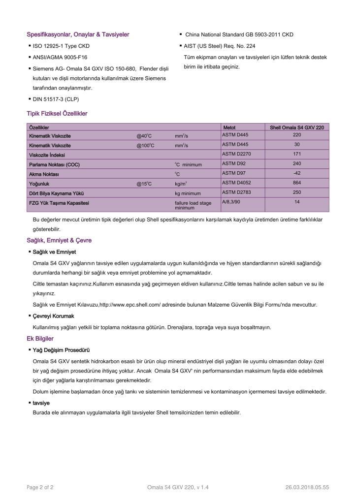 Shell Omala S4 GXV 68 ve 150 - 1000 viskozite sınıflarında üretilmektedir.