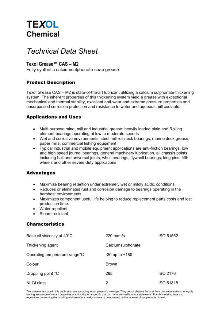 Texol Grease CAS - M2, bir kalsiyum sülfonat koyulaştırma sistemi kullanan son teknoloji ürünü bir yağlayıcıdır. Bu kalınlaştırma sisteminin doğal özellikleri, olağanüstü mekanik ve termal stabilite, mükemmel aşınma önleyici ve aşırı basınç özellikleri ve eşsiz korozyon koruması ve su ve sulu değirmen soğutucularına karşı dirençli bir gres sağlar.
